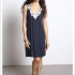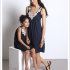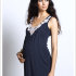 Платье выполнено из мягкой, струящейся ткани темно-синего цвета. Горловина платья украшена вышивкой и прозрачными блестками, доступ к груди закрыт центральными складками ткани. Конструкция платья позволяет носить его и во время беременности, и после родов.